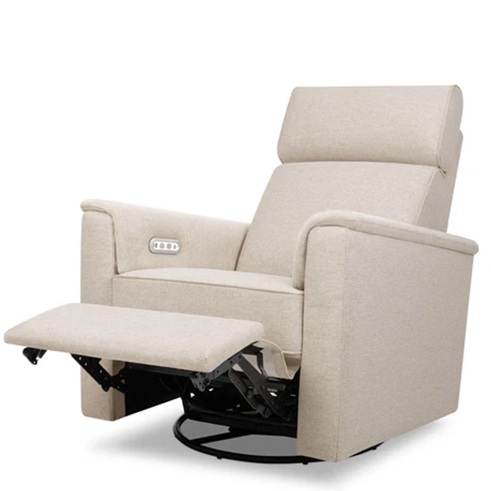 Relax in style with this power glider recliner in a soft Beach Eco-Weave finish, offering both elegance and practicality for modern nurseries and living spaces. The smooth power recline and adjustable power headrest provide customized comfort, while the tall pillowback supports parents of all heights. Its gentle swivel and glide motions make it perfect for feeding, soothing, or simply unwinding. Upholstered in eco-performance Beach Eco-Weave fabric made from recycled materials, it’s water-repellent and stain-resistant for lasting durability. GREENGUARD Gold, CertiPUR-US®, and FSC® certified, it promotes a healthier home environment. Ideal for families in Los Angeles, Eagle Rock, Pasadena, and Glendale, this chair also features USB and USB-C charging ports for small devices, blending style, comfort, and convenience.